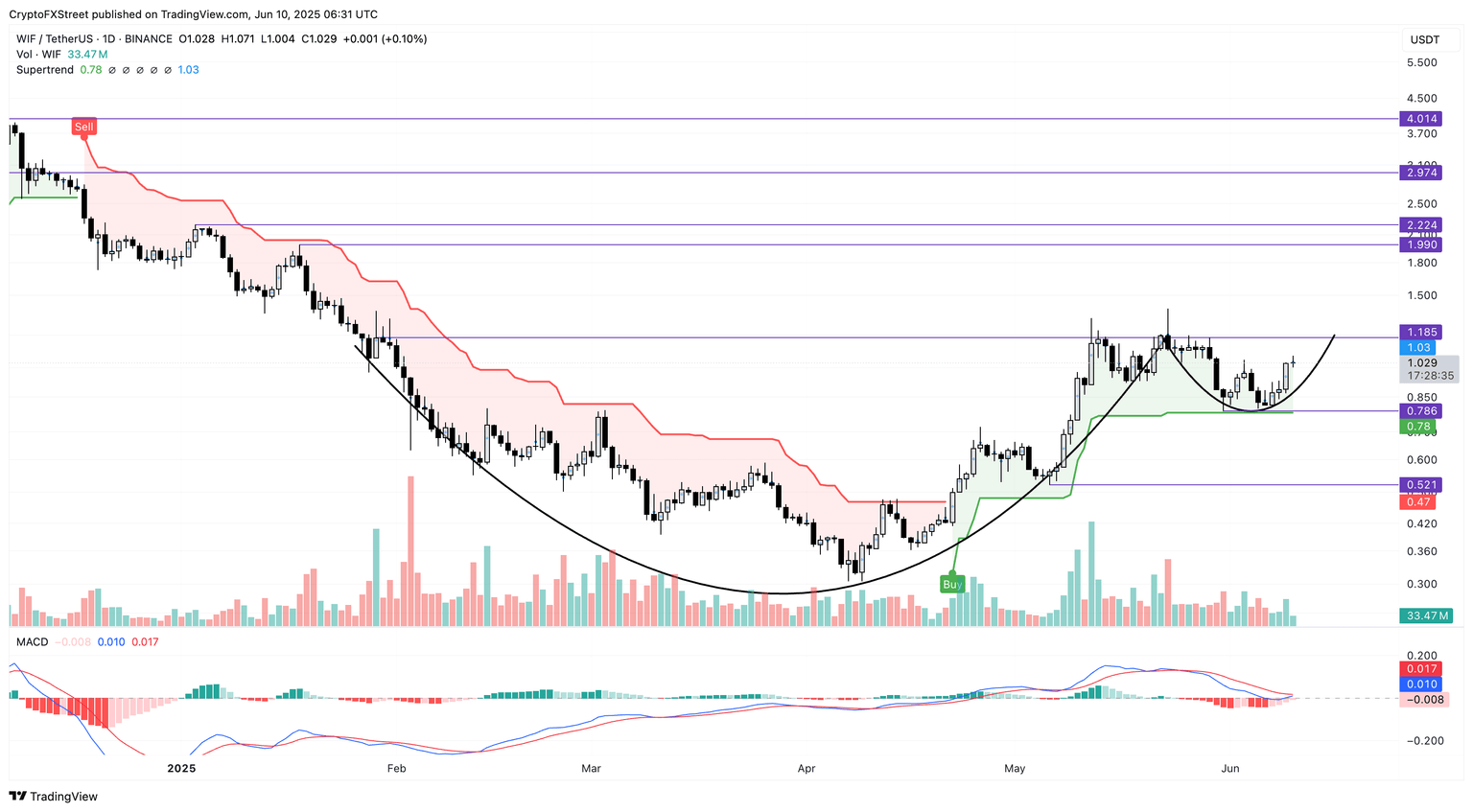 La moneda meme rompe un patrón de doble fondo formado sobre el soporte de 0.786$ en las últimas dos semanas al superar el nivel de 1$. Además, WIF presenta un patrón de copa y asa en el gráfico diario (ver abajo), con un nivel de cuello en 1.185$, el precio de cierre más alto desde febrero.