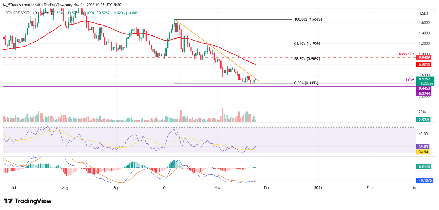 El precio de SPX6900 volvió a probar el mínimo del 10 de octubre de 0.445$ el sábado y se recuperó un 9.5% al día siguiente. Al momento de escribir el lunes, extendió su recuperación, acercándose a la línea de tendencia descendente alrededor de 0.525$.