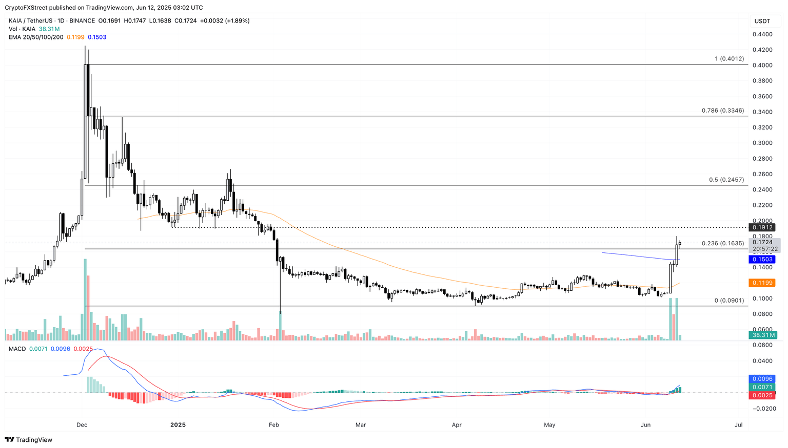 KAIA ha subido más del 60% hasta ahora esta semana, cruzando por encima del nivel de Fibonacci del 23.6% en 0.1635$, retrocedido desde el precio de cierre más alto en 0.4012$ hasta el mínimo histórico en 0.0901$.