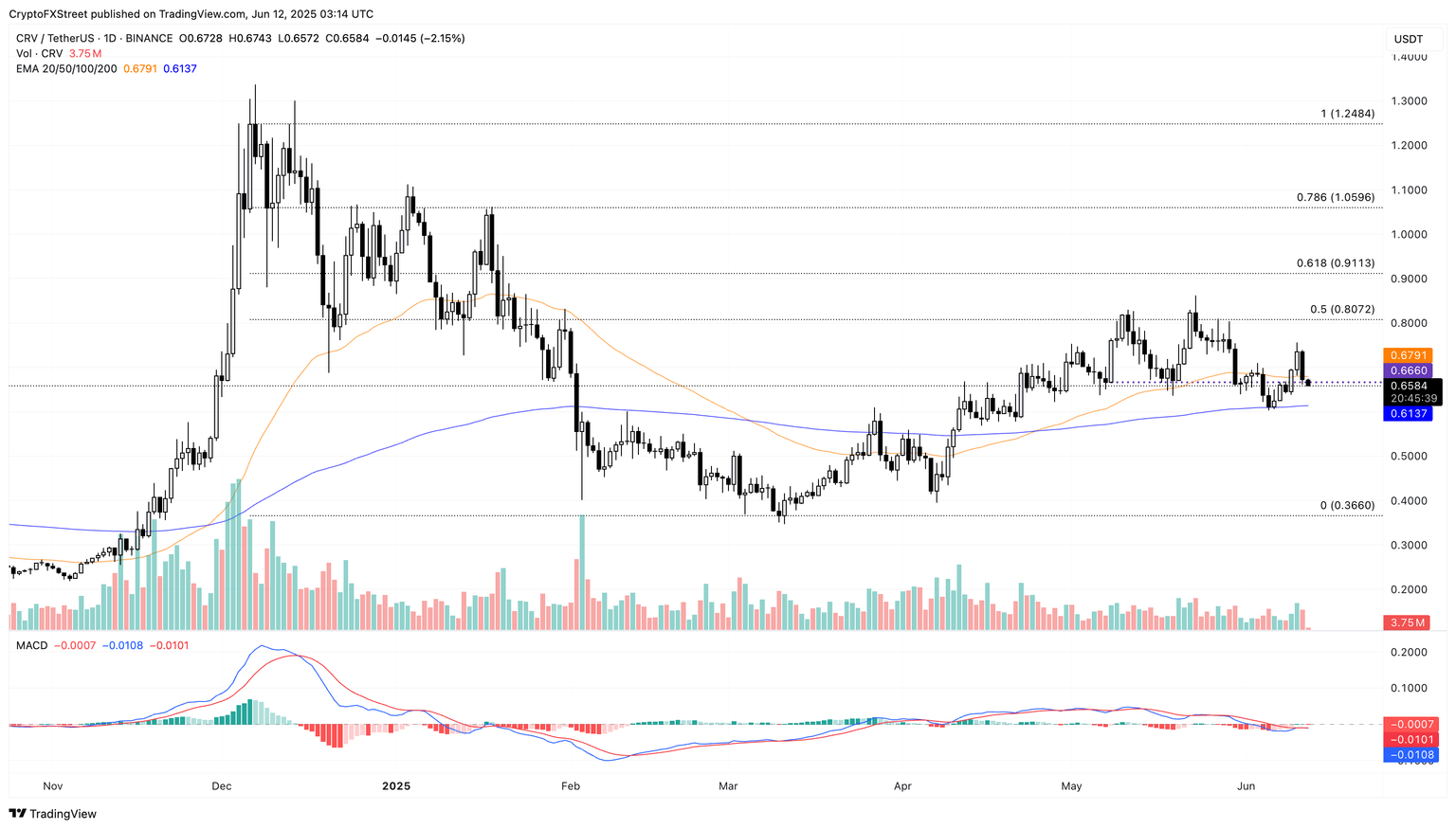 CRV forma una vela envolvente bajista con una repentina caída del 8.56% el miércoles. En el momento de la redacción, CRV extiende las pérdidas en más del 2% y se negocia a 0.6584$.