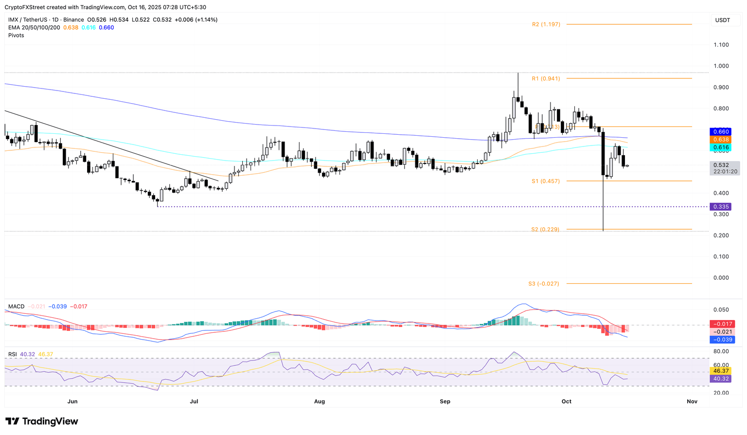 Immutable cotiza por encima de la marca psicológica de 0.50$ al momento de la publicación el jueves, manteniéndose estable tras la racha de retrocesos de dos días. La tendencia a la baja en las EMAs de 50 días y 100 días arriesga un posible cruce bajista, que podría considerarse una señal de venta a medida que el declive a corto plazo gana tracción.
