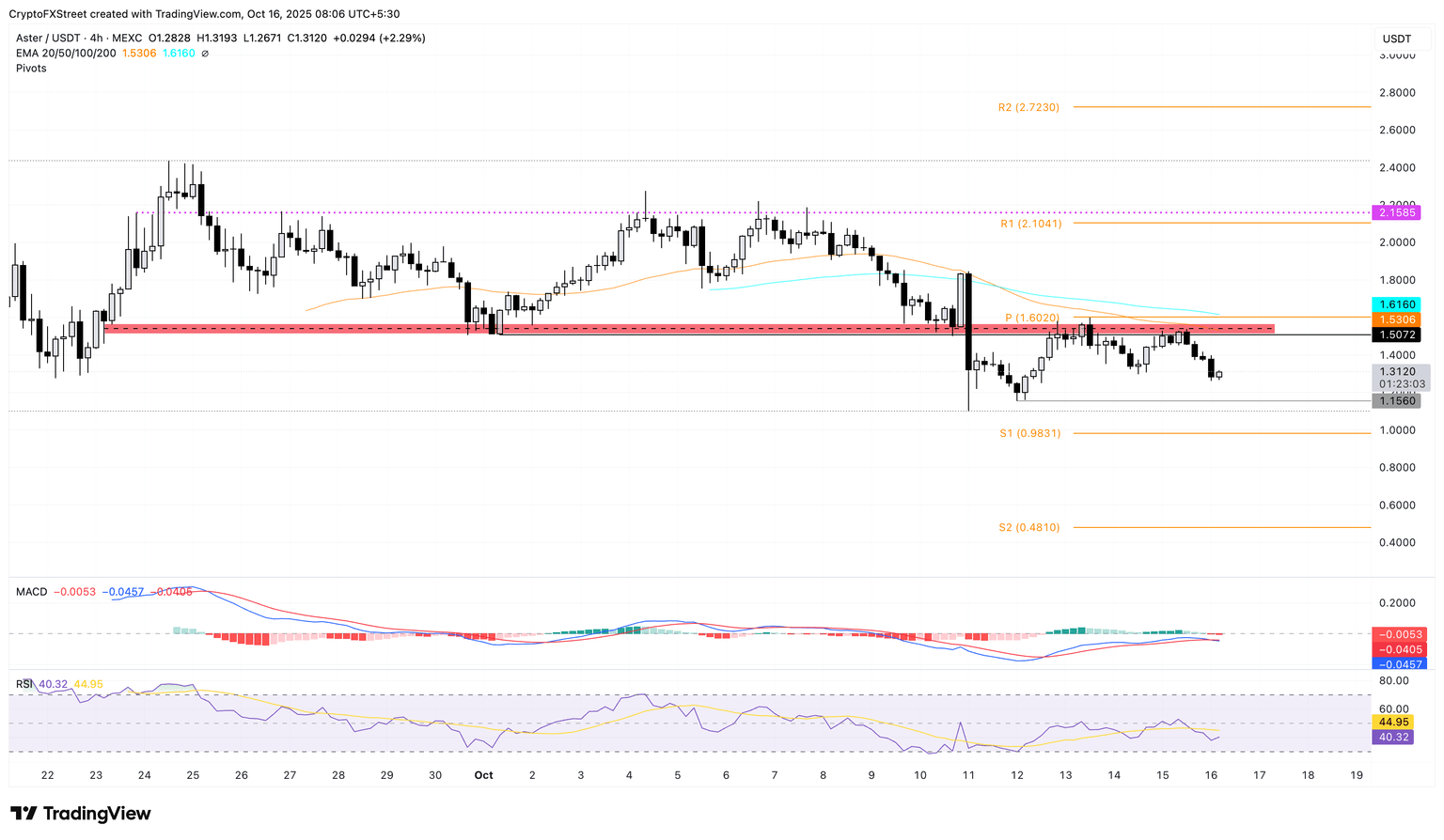 Aster cotiza a 1.30$ al momento de la publicación el jueves, tras una caída del 14% respecto al día anterior. El token de intercambio descentralizado (DEX) respaldado por Binance revirtió desde la zona de suministro de 1.50$ en el gráfico de 4 horas, mirando hacia el nivel de 1.15$ desde el domingo.