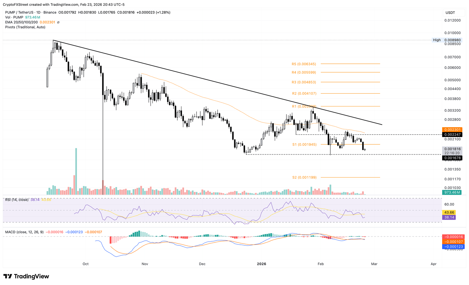 Pump.fun cotiza cerca de 0.001800$ en el momento de la redacción el martes, tras una caída del 11% el lunes. El token de lanzamiento de meme coin ha extendido su caída general desde finales de septiembre, apuntando al nivel de soporte de 0.001678$, que anteriormente ayudó a desencadenar un rebote el 6 de febrero.
