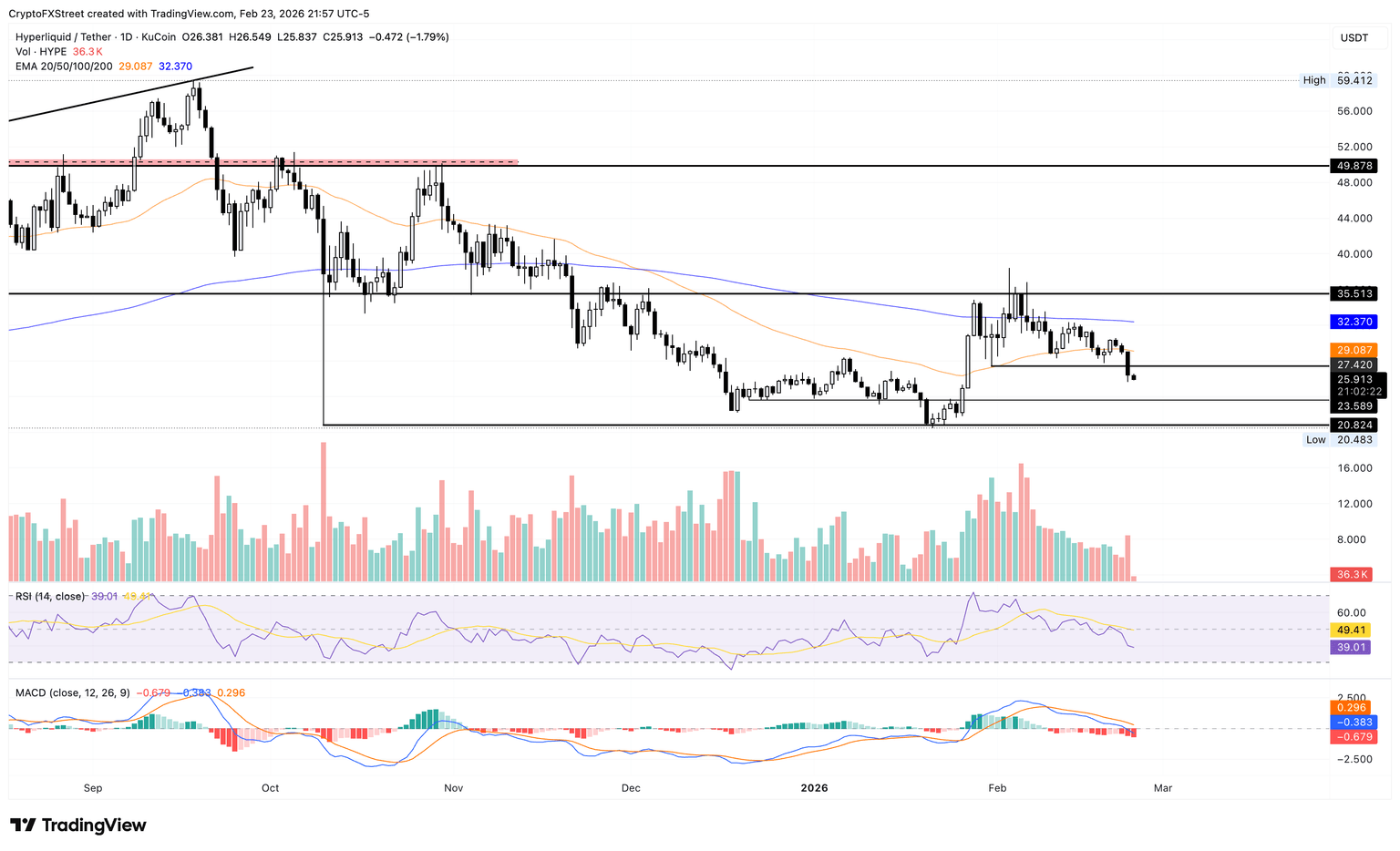 Hyperliquid está cotizando por debajo de 26$ en el momento de escribir el martes, extendiendo la caída tras una disminución del 9% el día anterior. El token HYPE disminuye por cuarto día consecutivo, cotizando significativamente por debajo de la EMA de 50 días en 29.08$ y la EMA de 200 días en 32.37$, reafirmando el sesgo bajista.
