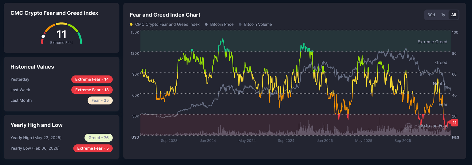 El Índice de Miedo y Codicia de CoinMarketCap en 11 muestra un miedo extremo en el mercado, reafirmando que los vendedores son dominantes.