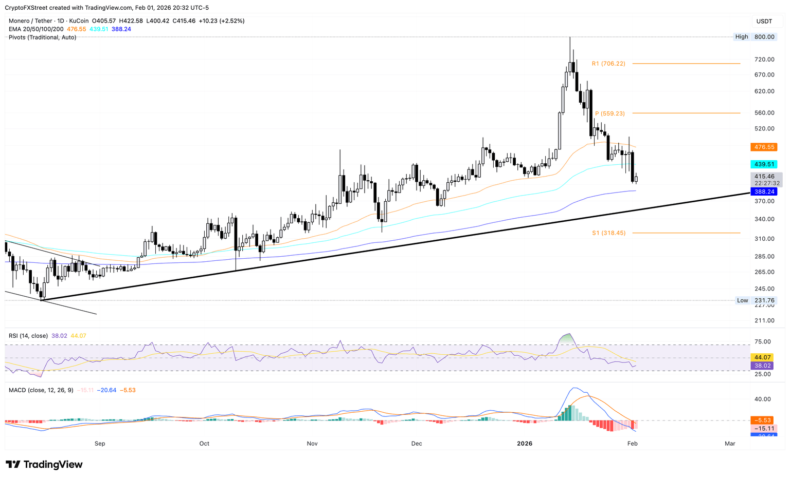 Si Monero se mantiene por encima de 400$ o de la EMA de 200 días en 388$, podría rebotar hacia la EMA de 100 días en 439$.