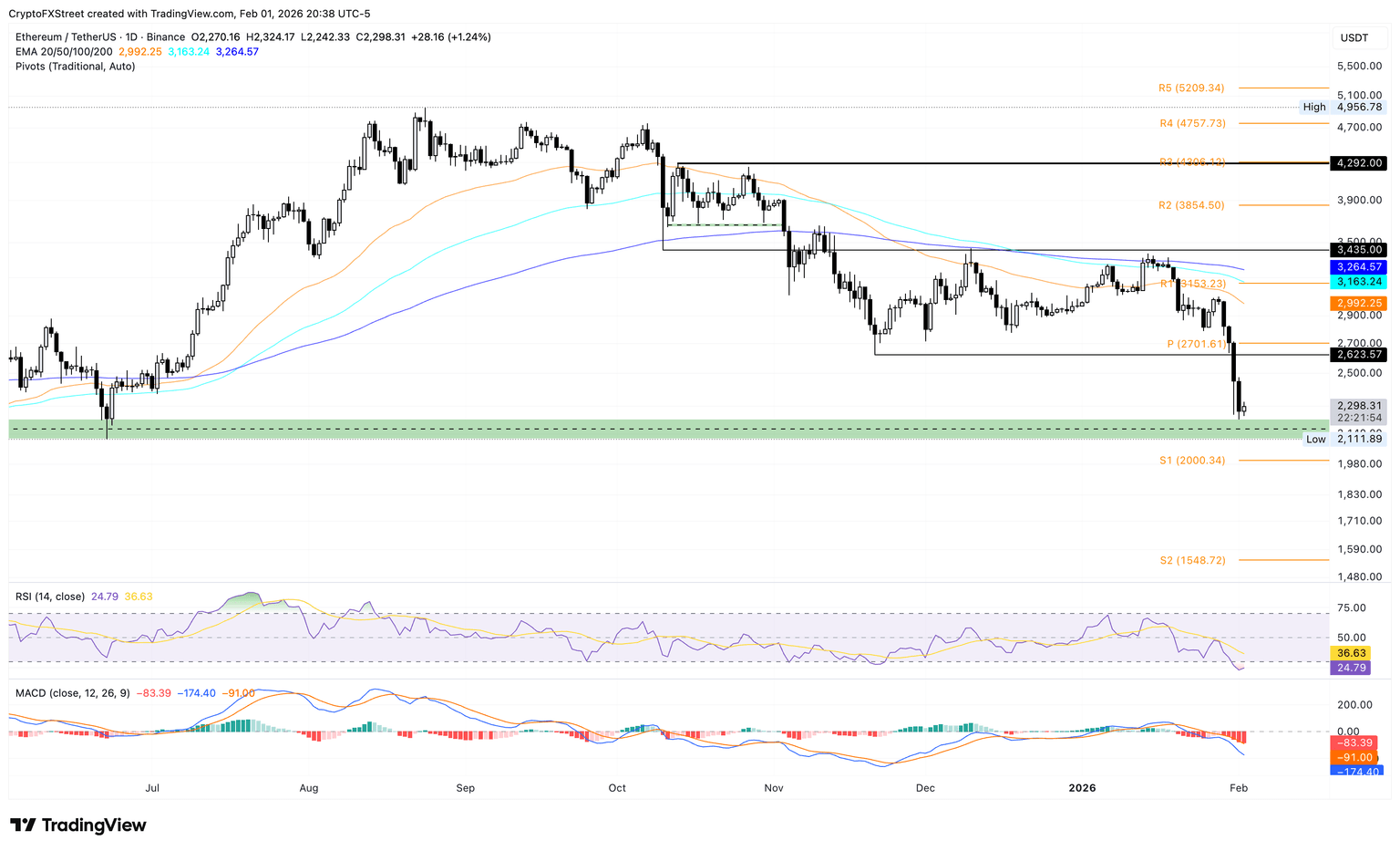 Si Ethereum marca un cierre diario por debajo de 2.111$, se abriría la puerta al Punto Pivote S1 cerca de la marca psicológica de 2.000$.