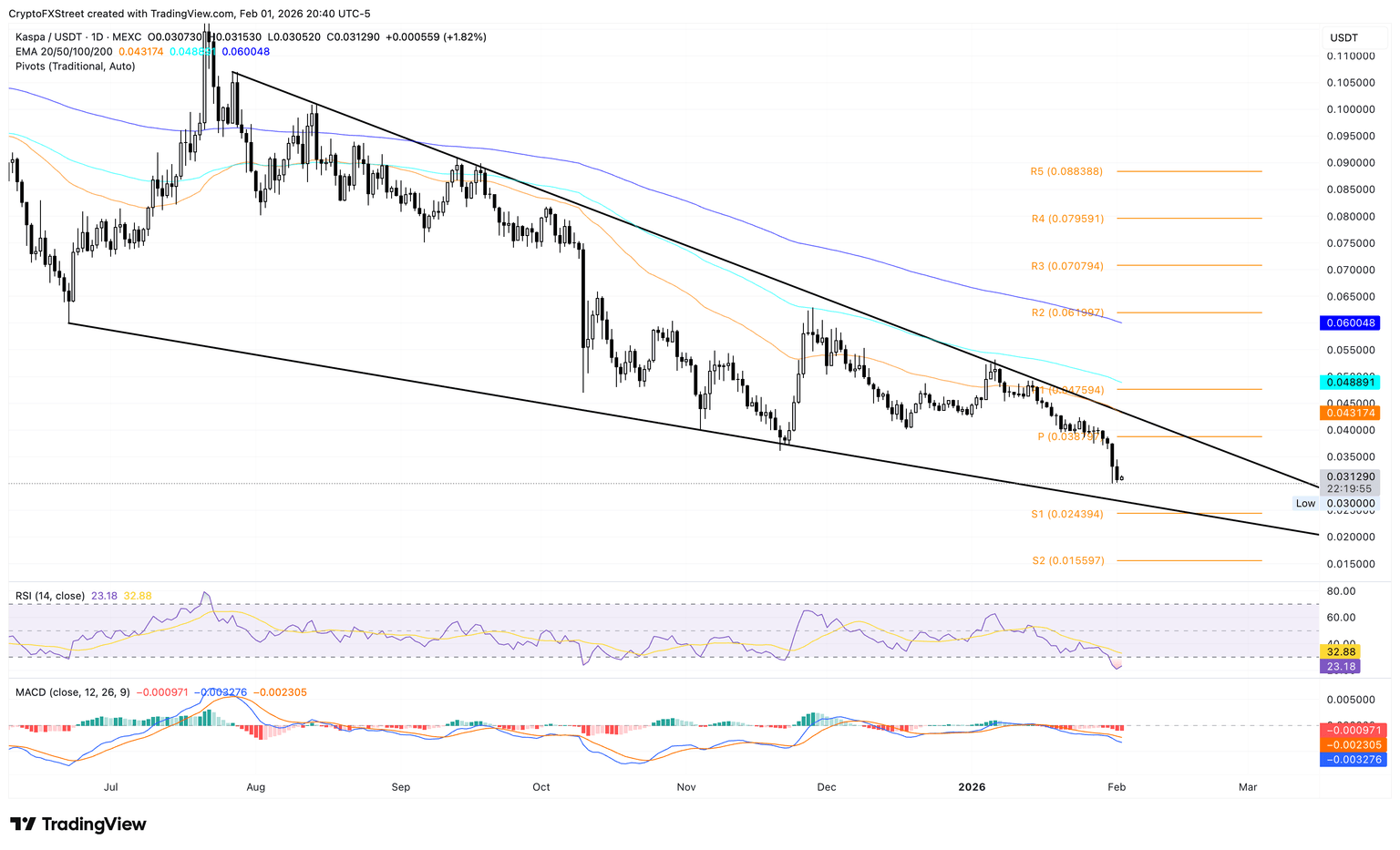 Kaspa se encuentra cerrando cerca de 0.3000$ en el momento de la redacción el lunes, continuando su caída tras una pérdida del 22% la semana pasada. La tendencia a la baja en KAS se acerca a la línea de tendencia de soporte de un patrón de cuña descendente en el gráfico logarítmico diario, cerca del Punto Pivote S1 en 0.02439$.