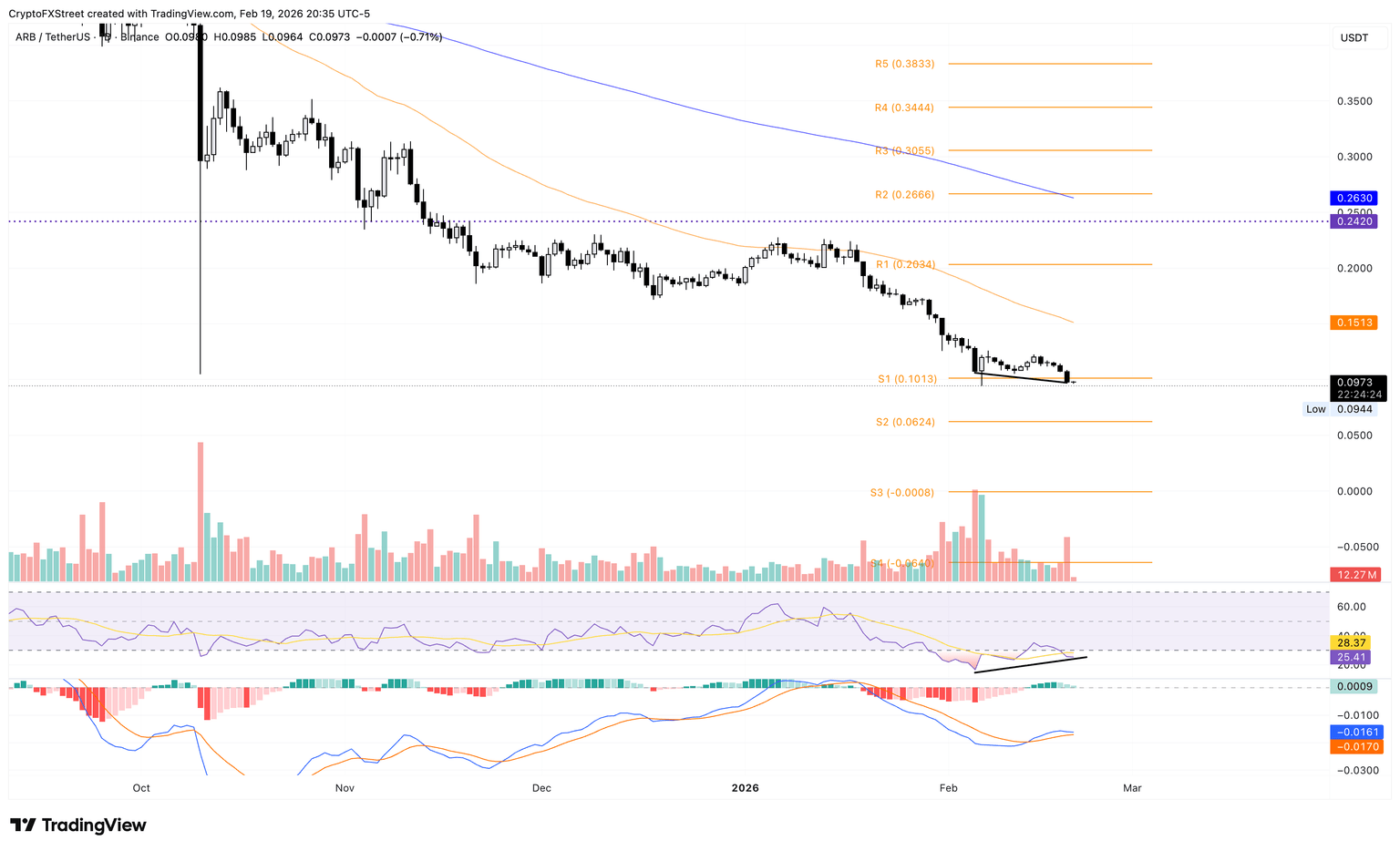 Arbitrum se está negociando por debajo del nivel psicológico de 0.1000$ al momento de escribir el viernes, tras una caída del 9% el día anterior. El token ARB ha estado en una caída constante desde el domingo, registrando una pérdida de más del 15% hasta ahora esta semana.