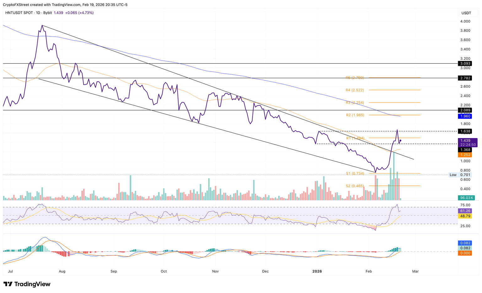 La tendencia alcista lucha por superar el cierre diario del 2 de enero de 1.638$, que sirve como resistencia a corto plazo. Si HNT supera este nivel, podría probar la EMA de 200 días en 1.26$.