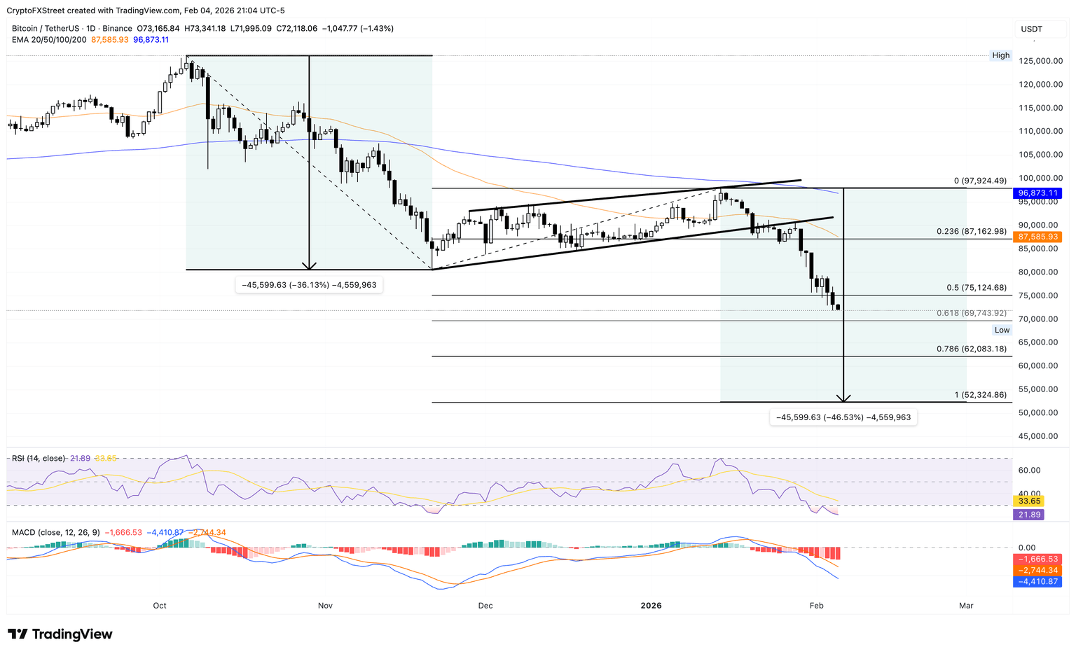 La tendencia a la baja en Bitcoin refleja una extensión a la baja de un patrón de bandera bajista, acercándose al nivel de extensión de Fibonacci del 61.8% basado en la tendencia en 69.743$, medido entre el máximo del 6 de octubre de 126.199$ y el mínimo del 21 de noviembre en 80.600$, con una tercera pierna más alta en el máximo del 15 de enero de 97.924$.