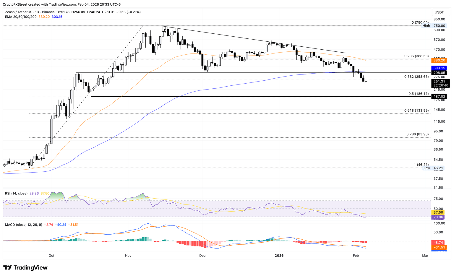 Zcash cotiza cerca de 250$ en el momento de la publicación el jueves, por debajo de las EMAs de 50 y 200 días, que se inclinan hacia abajo y se acercan a un posible patrón de Cruce de la Muerte. La moneda de privacidad retrocedió a la baja en el nivel de 300$, alineándose con la EMA de 200 días, cruzando el nivel de retroceso de Fibonacci del 38.2% en 258$, medido desde el mínimo del 22 de septiembre en 46$ hasta el máximo del 7 de noviembre en 750$.