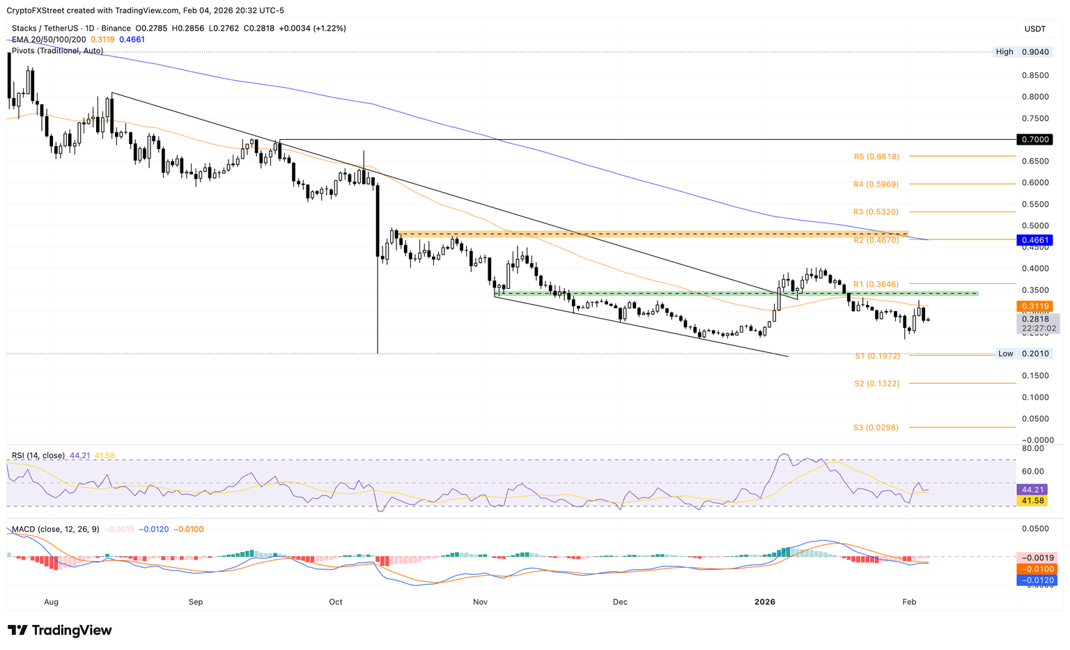 Mirando hacia abajo, el soporte clave para Stacks sigue siendo el mínimo del 10 de octubre en 0.2010$.