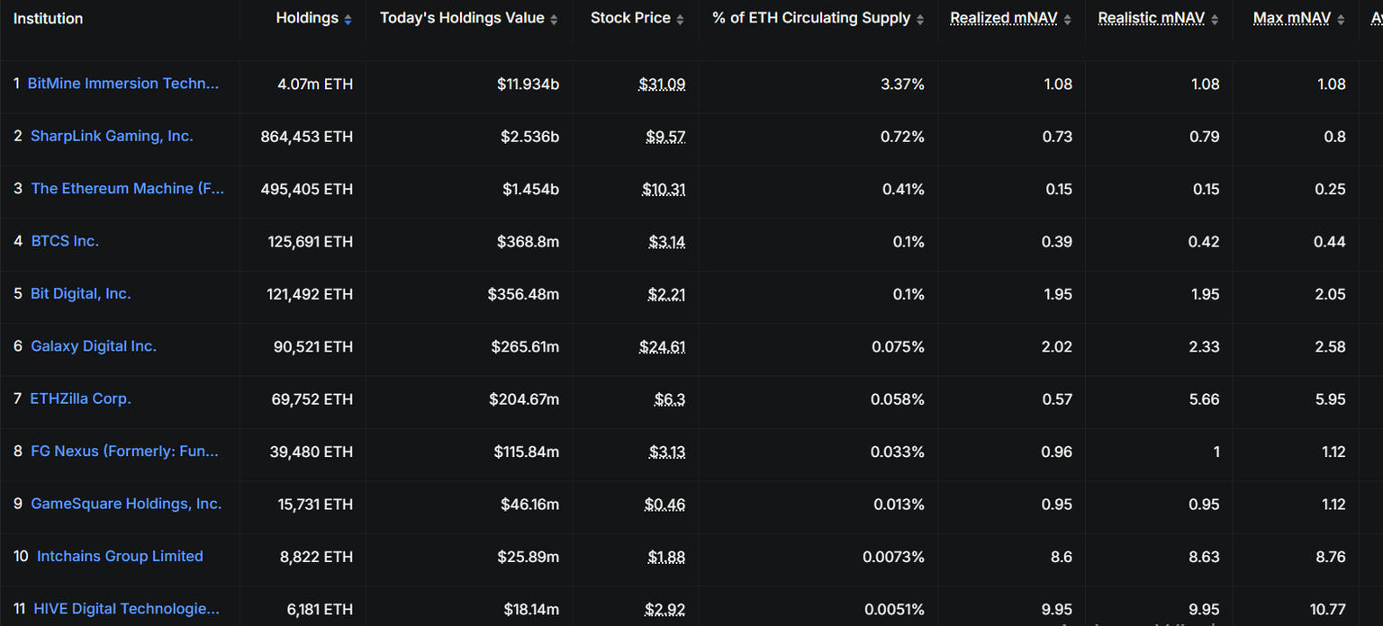 Lanzado con un objetivo ambicioso de adquirir el 5% de la oferta circulante de ETH, BitMine hizo crecer su tesorería de ETH para convertirse en la más grande a nivel mundial en unos pocos meses desde su lanzamiento. La compañía ha acumulado 3.97 millones de ETH desde julio y ahora ocupa el segundo lugar en tesorerías de criptomonedas detrás de Strategy.