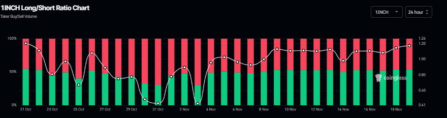 Además, la relación larga-corta de Coinglass para 1INCH se sitúa en 1.17 el miércoles, el nivel más alto en más de un mes. La relación por encima de uno sugiere que más operadores están apostando a que el precio de 1INCH suba.