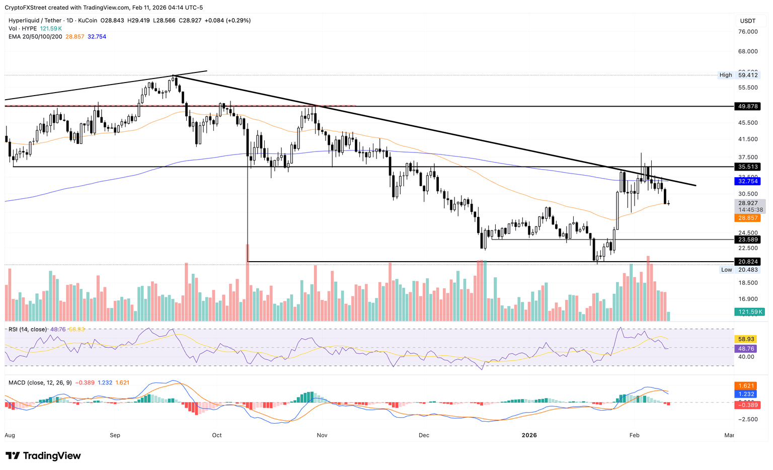 Sin embargo, si HYPE asegura un cierre diario por encima de la EMA de 50 días en 28.85$, aliviaría la presión inmediata y podría abrir un empuje hacia la EMA de 200 días en 32.75$.