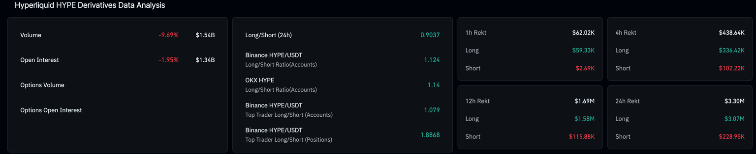 Consistente con la caída del OI, las liquidaciones largas durante el mismo período totalizaron 3.07 millones$, significativamente más altas que las liquidaciones cortas de 228.950$, reflejando la caza alcista en los derivados de HYPE. Esta liquidación sesgada hacia lo largo ha reducido la relación larga-corta a 0.9037, que está por debajo de 1, indicando que más posiciones cortas están activas en el mercado.