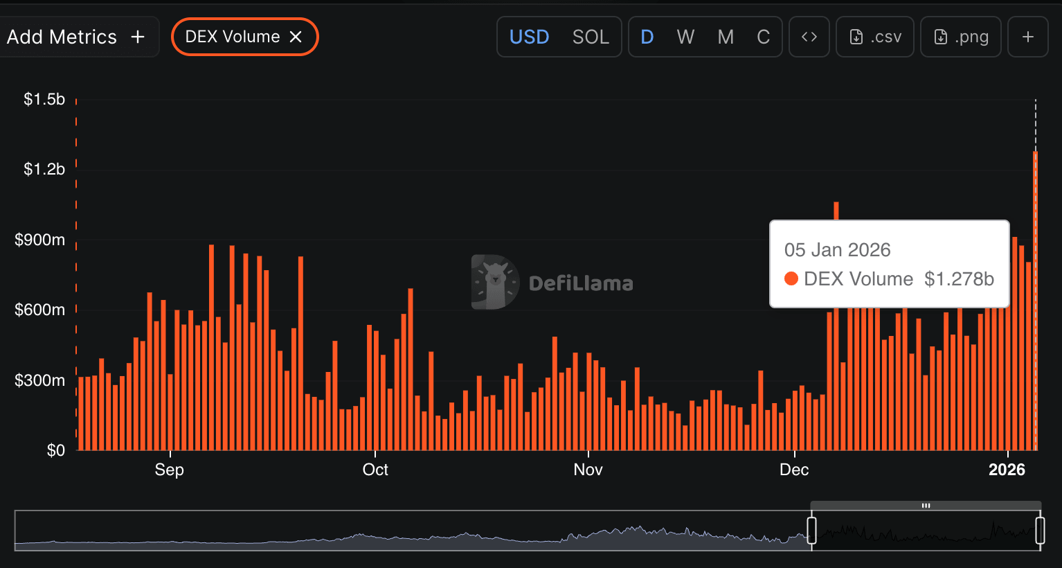 La actividad comercial de monedas meme ha aumentado en los últimos días, empujando el volumen del DEX en Pump.fun a 1.280 millones de dólares hasta el lunes, un aumento desde aproximadamente 805 millones de dólares el día anterior.