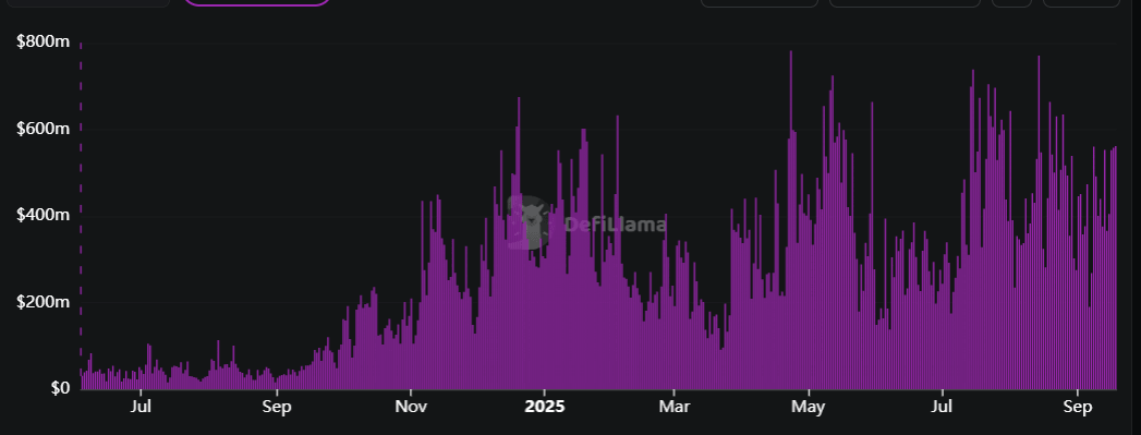 Los datos de DeFiLlama muestran que el volumen de negociación de SUI en el intercambio descentralizado (DEX) aumentó de 552.91 millones de dólares el sábado a 561.63 millones de dólares el jueves, marcando el volumen más alto en septiembre e indicando un creciente interés y liquidez por parte de los traders, lo que refuerza la perspectiva alcista de la plataforma.