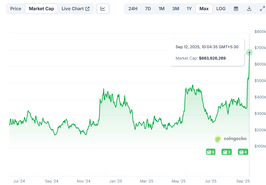 El precio de Aethir ha aumentado más del 90% hasta ahora esta semana, alcanzando un máximo de cuatro meses, con su capitalización de mercado superando los 683.92 millones de dólares el viernes, según datos de CoinGecko, mostrados a continuación.