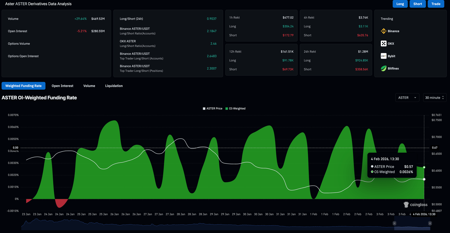 En el lado de los derivados, los datos de CoinGlass muestran que el interés abierto de futuros de ASTER (OI) ha bajado un 5.21% en las últimas 24 horas a 280.55 millones de dólares, lo que indica un menor valor de contratos pendientes. Al mismo tiempo, la tasa de financiación ponderada por OI se sitúa en 0.0026%, bajando de 0.0046% en su pico el día anterior, lo que sugiere que el interés alcista ha disminuido significativamente.