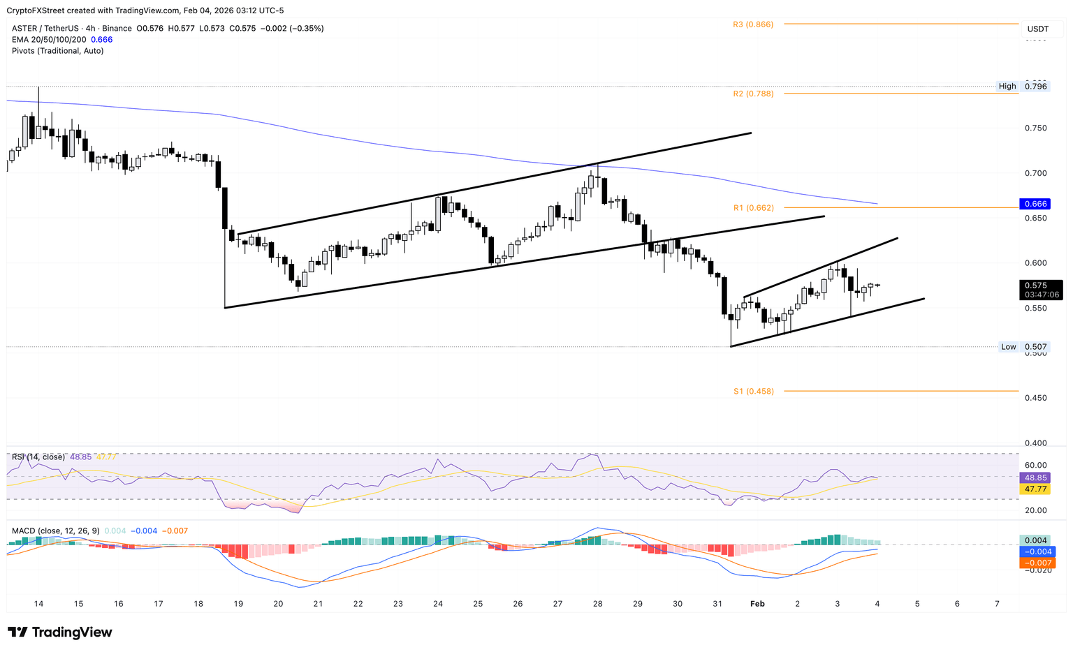Aster cotiza por debajo de la media móvil exponencial (EMA) de 50 períodos en 0.66$ en el gráfico de precios de 4 horas, lo que sugiere un sesgo bajista más amplio. A corto plazo, ASTER forma un canal ascendente expandido después de la ruptura bajista de un patrón similar pero más grande en el mismo gráfico.
