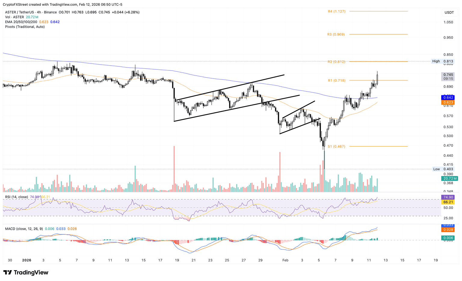 Si ASTER no logra mantenerse por encima de 0.718$, podría volver a probar la EMA de 200 períodos en 0.642$.