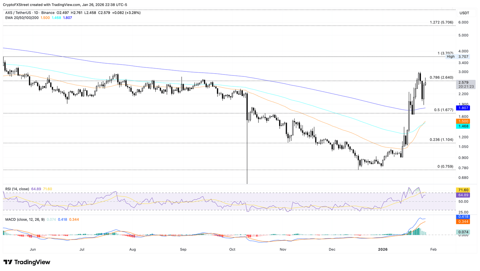 AXS debería superar el nivel de retroceso de Fibonacci del 78.6% en 2.640$, medido desde el máximo del 14 de mayo de 3.707$ hasta el mínimo del 17 de diciembre de 0.759$, para volver a poner en el mapa los 3.707$.