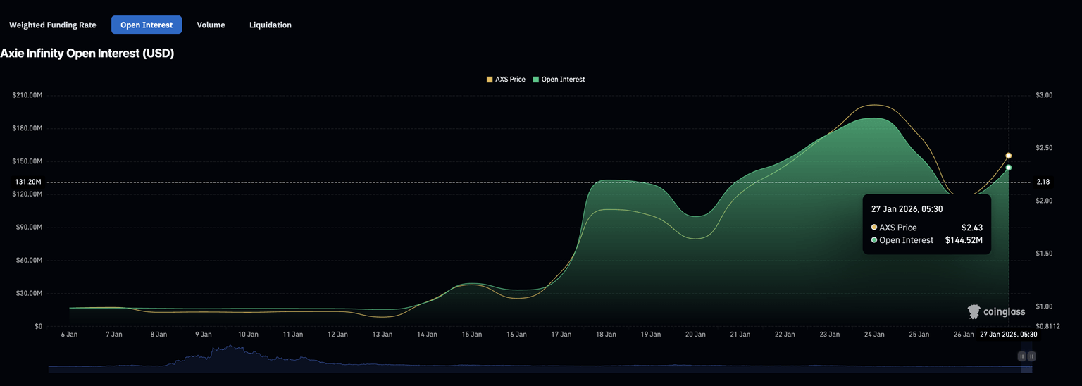 En el lado de los derivados, el lanzamiento del nuevo token bAXS renovó los flujos de capital hacia los futuros de AXS, llevando el interés abierto a un pico de 189,52 millones de dólares el sábado, desde menos de 14 millones de dólares el 1 de enero. En el momento de la redacción, el interés abierto de AXS se sitúa en 144,52 millones de dólares, manteniendo niveles no vistos desde mayo de 2022. Este aumento en el valor nocional de los contratos de AXS pendientes refleja una mayor confianza de los inversores en el token de juego.