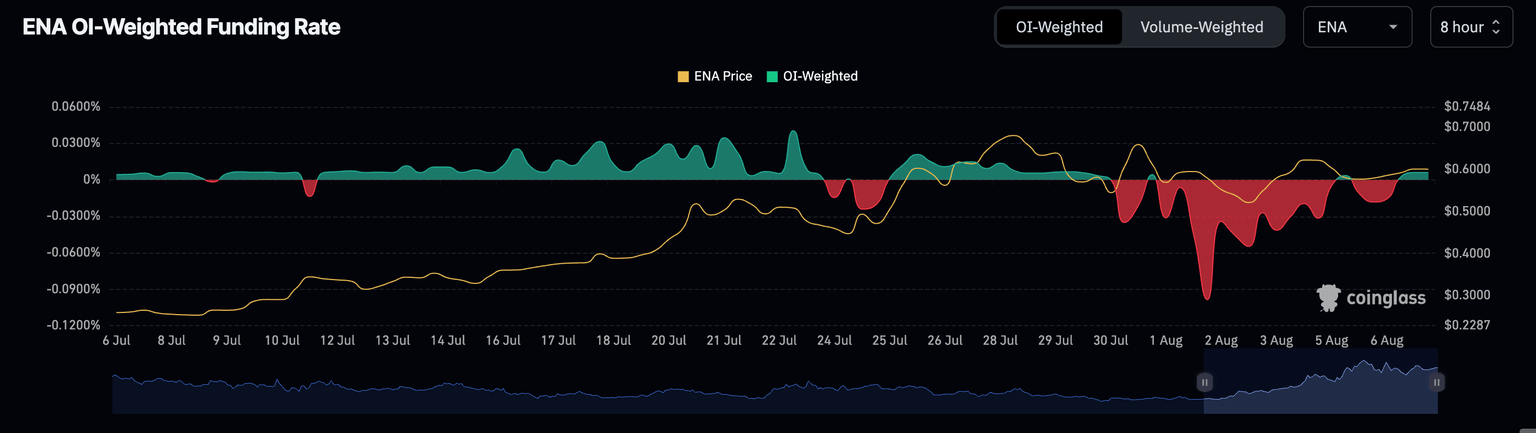 Un aumento persistente en el OI indica que los operadores tienen una fuerte convicción en la tendencia alcista y están dispuestos a apalancar posiciones largas. La tasa de financiación positiva (gráfico a continuación) afirma la perspectiva alcista. A medida que mejora el sentimiento, la probabilidad de que Ethena supere el siguiente obstáculo en 0.70$ y luego extienda el rally por encima del nivel crítico de 1.00$ aumentaría significativamente.