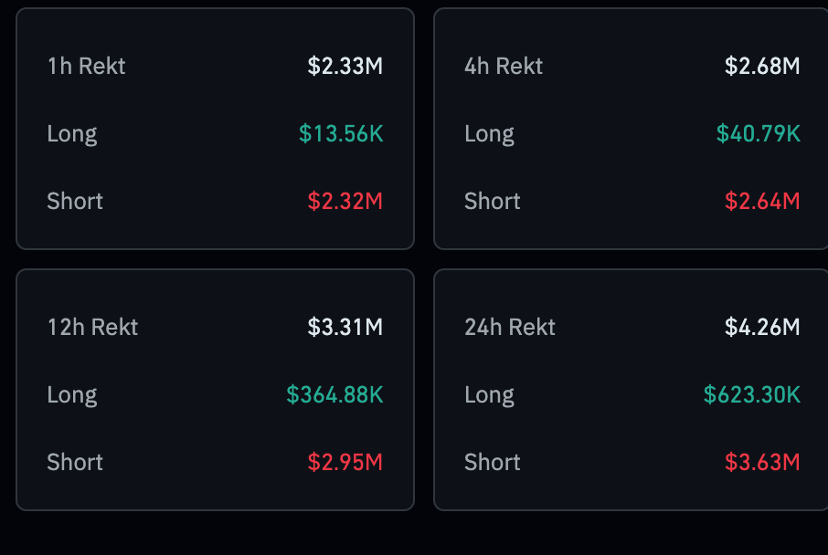 Mientras tanto, las liquidaciones en el mercado de derivados alcanzaron aproximadamente 4.2 millones de dólares en las últimas 24 horas. Los tenedores de posiciones cortas representaron la mayor parte de las liquidaciones, con alrededor de 3.63 millones de dólares eliminados en comparación con aproximadamente 623.000$ en largos. El aumento en las liquidaciones de posiciones cortas subraya el caso alcista de Ethena.
