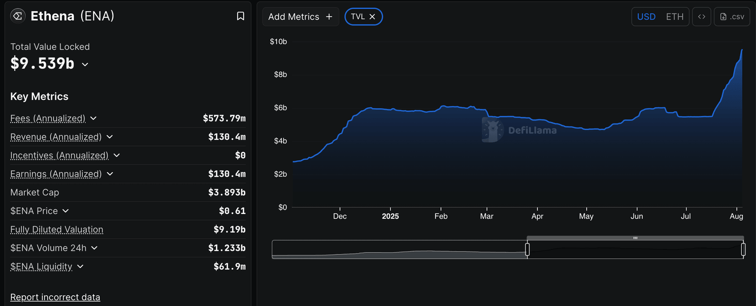El ecosistema DeFi de Ethena ha estabilizado su crecimiento en los últimos meses, con su Valor Total Bloqueado (TVL) alcanzando un máximo de alrededor de 9.54 mil millones de dólares desde los 4.72 mil millones registrados el 4 de mayo.