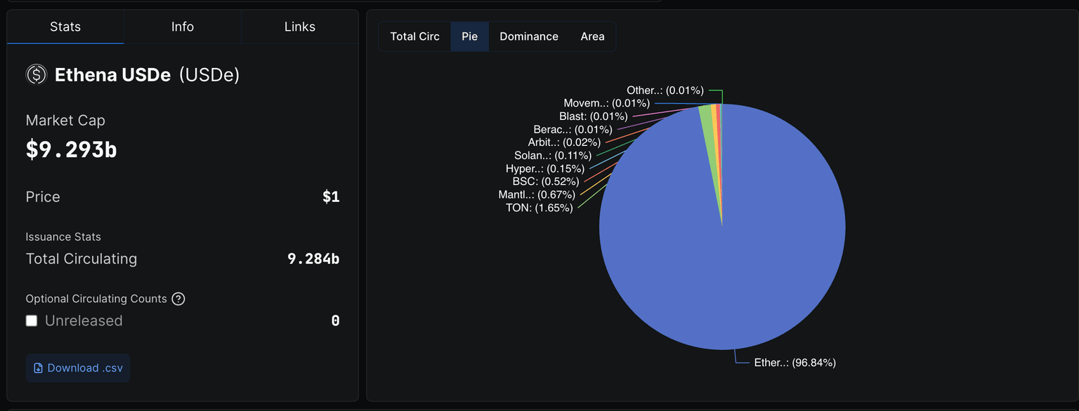 La stablecoin USDe de Ethena también ha experimentado un crecimiento significativo este año, alcanzando una capitalización de mercado de 9.23 mil millones de dólares, según datos de DefiLlama. USDe vio la mayor tasa de crecimiento, de más del 75%, en los últimos 30 días, convirtiéndose en la tercera stablecoin más grande después de USDT de Tether.