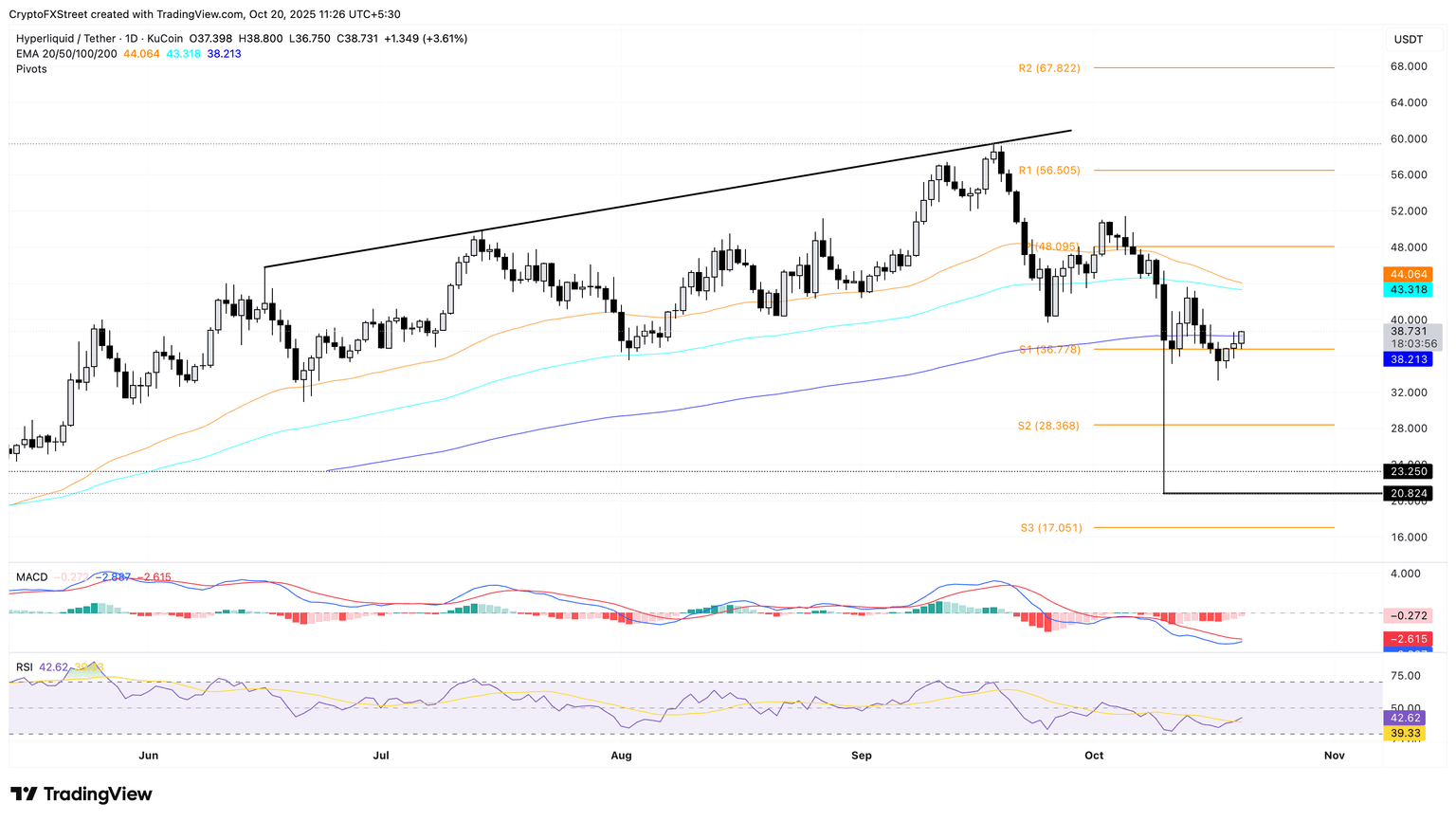 Hyperliquid avanza por tercer día consecutivo, cotizando por encima de 38$ y la EMA de 200 días. Un cierre decisivo por encima de esta línea media podría apuntar a la EMA de 100 días en 43$, seguido por el nivel de Punto Pivote en 48$.