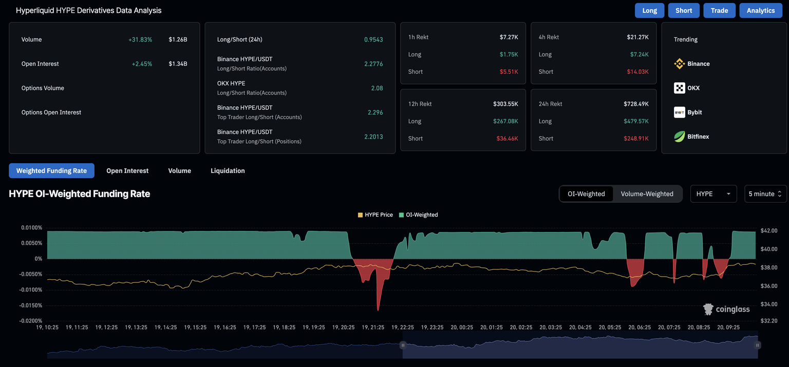 A pesar de la disminución de la actividad de los usuarios, el renovado interés minorista en el token HYPE refleja la anticipación de los operadores de una posible recuperación. Los datos de CoinGlass muestran que el OI de HYPE se sitúa en 1.34 mil millones de dólares el lunes, un aumento del 2.45% en las últimas 24 horas, lo que indica que los operadores están dispuestos a asumir más riesgos, ya sea construyendo más posiciones largas o aumentando el apalancamiento.