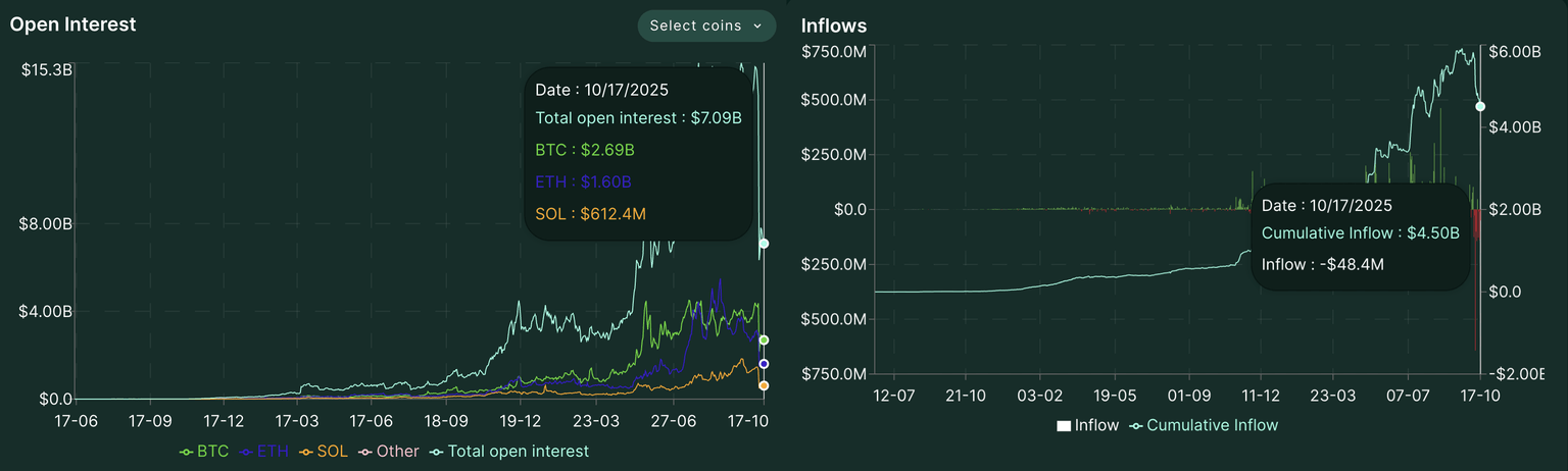 Según las estadísticas oficiales de Hyperliquid, el interés abierto total (OI), el valor nocional de todos los contratos vigentes en la plataforma, estaba en 7.20 mil millones de dólares el viernes, en comparación con 15.10 mil millones de dólares el 9 de octubre. La caída de más del 50% en el OI sugiere un sentimiento de aversión al riesgo entre los operadores, lo que podría impactar negativamente la demanda de Hyperliquid y su token nativo HYPE.