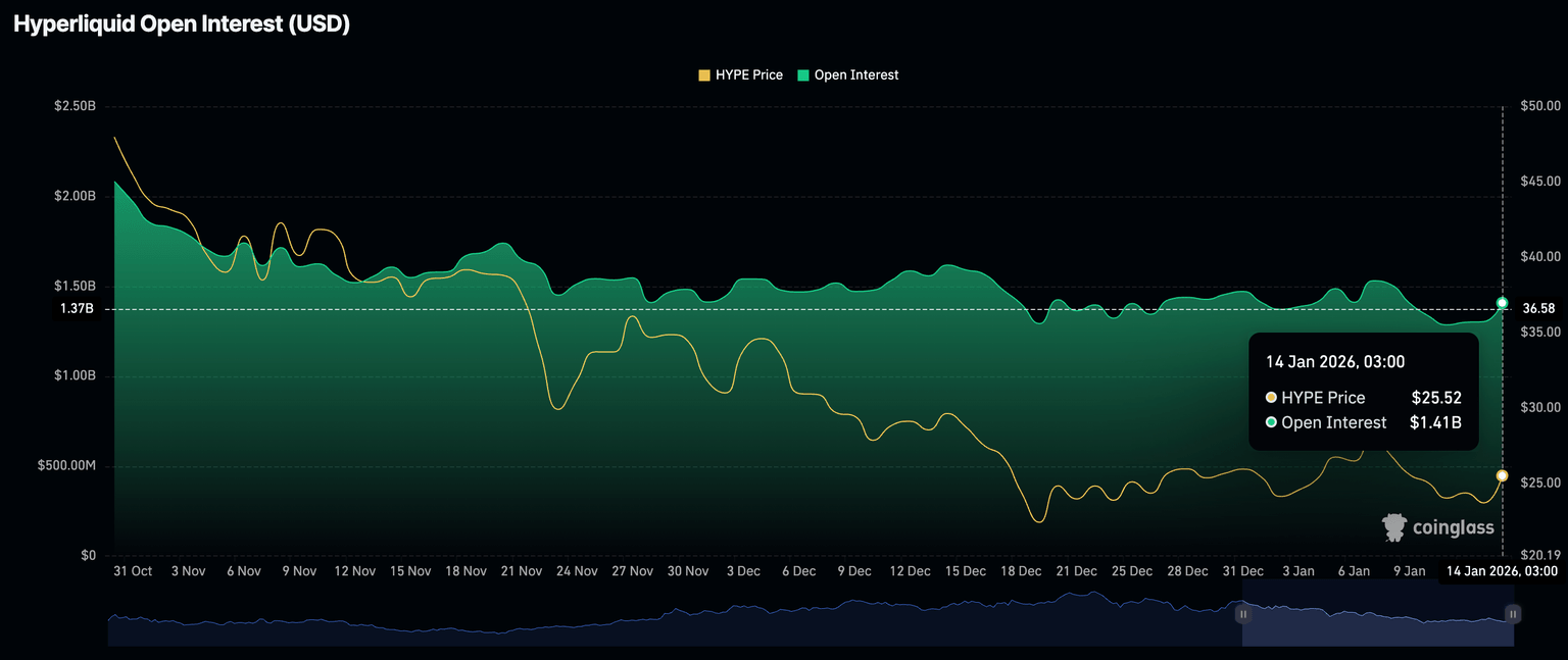 Mientras tanto, el mercado de derivados de Hyperliquid refleja el optimismo de los inversores por una recuperación de precios, con el Interés Abierto (OI) de futuros aumentando a 1.41 mil millones de dólares el miércoles desde 1.3 mil millones de dólares el martes.