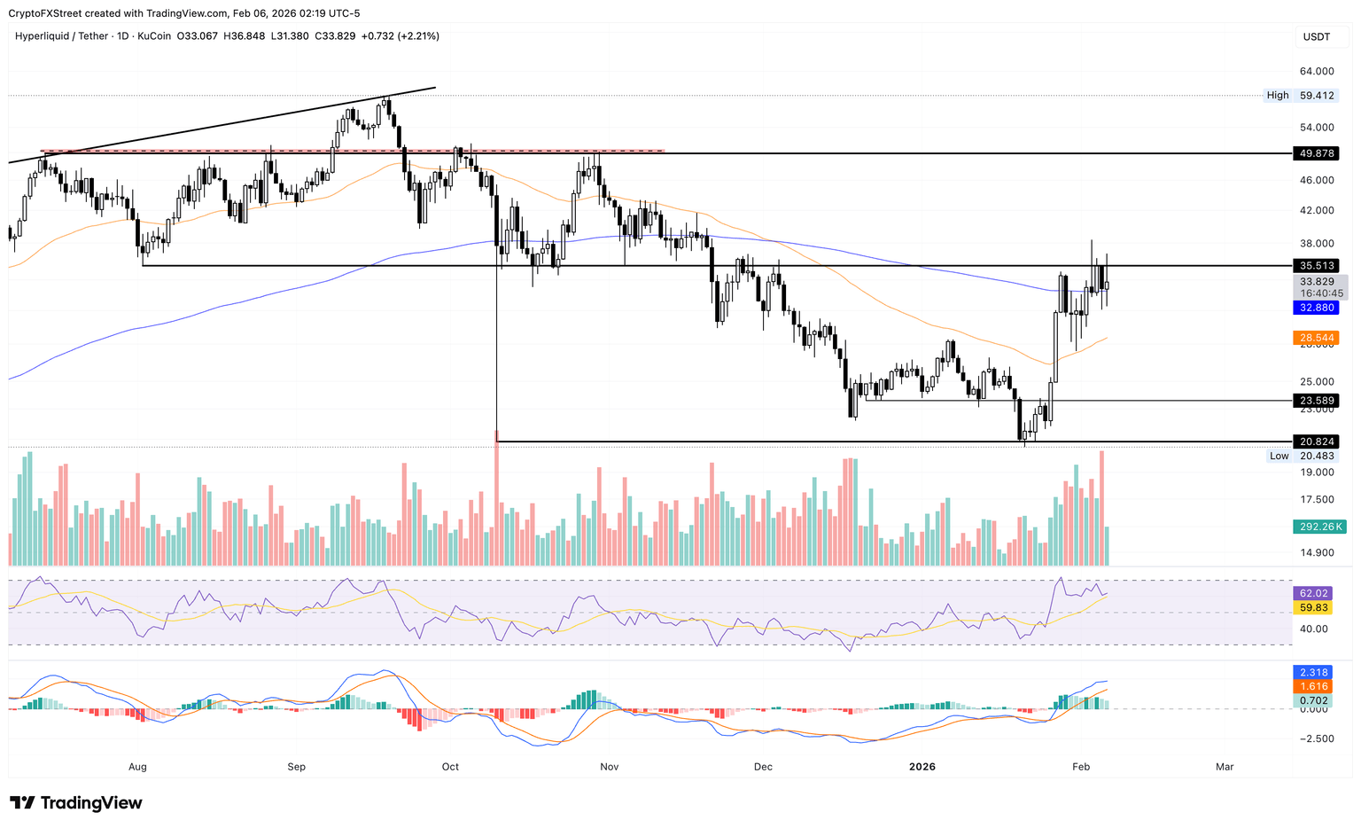 - Hyperliquid recupera casi un 3% hasta ahora el viernes, rebotando desde el soporte de la EMA de 200 días.