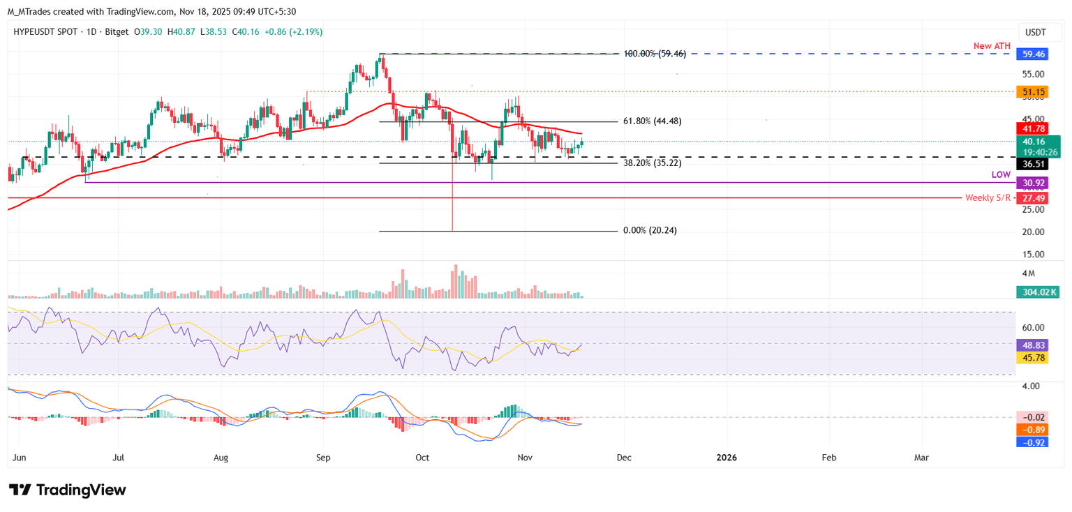 El precio de Hyperliquid rebotó tras volver a probar el soporte diario en 36.51$ el viernes, y casi subió un 5% en los siguientes tres días. En el momento de escribir este artículo el martes, HYPE continúa sus ganancias, cotizando por encima de 40$.