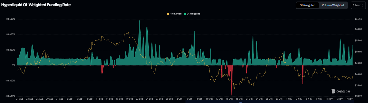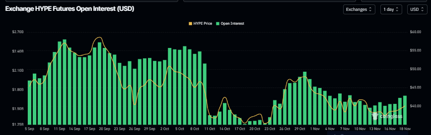 Los datos de CoinGlass muestran que el interés abierto de futuros de HYPE en los intercambios aumentó a 1.71 mil millones de dólares el martes, desde 1.52 mil millones de dólares el 12 de noviembre, y ha estado aumentando constantemente desde entonces. El aumento del interés abierto representa nuevo o adicional capital ingresando al mercado y nuevas compras, lo que podría alimentar el actual repunte del precio de HYPE.