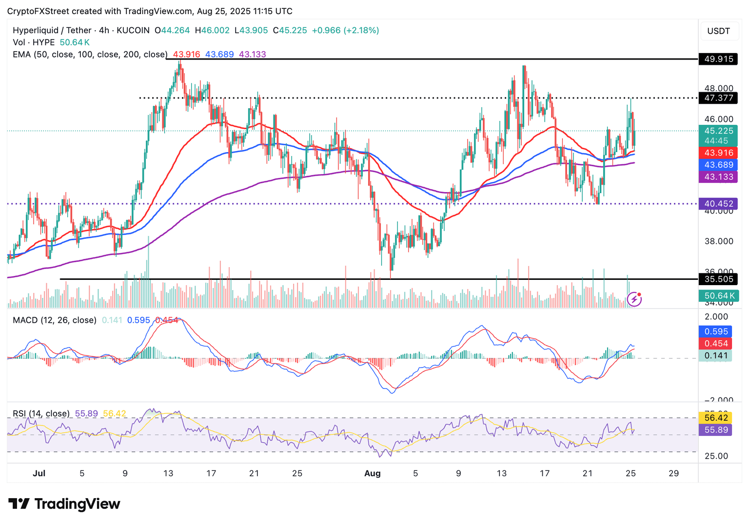 Hyperliquid muestra signos de extender la recuperación en las próximas sesiones, apuntando a un movimiento hacia su máximo histórico ligeramente por debajo de 50,00$. La media móvil exponencial (EMA) de 50 períodos en 43,91$ proporciona soporte inmediato, respaldada por la EMA de 100 períodos en 43,68$ y la EMA de 200 períodos en 43,13$.