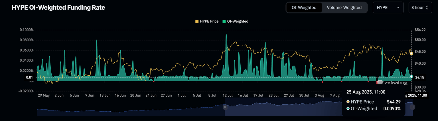Este aumento sostenido en el OI sugiere que más operadores están apostando por aumentos de precios a corto plazo. Sin embargo, los operadores deben proceder con precaución ya que la tasa de financiación de futuros ha disminuido al 0,0090% después de alcanzar un máximo de 0,0663% el 18 de agosto. En otras palabras, menos operadores están apalancando posiciones largas en HYPE, lo que podría disminuir el sentimiento positivo del mercado.