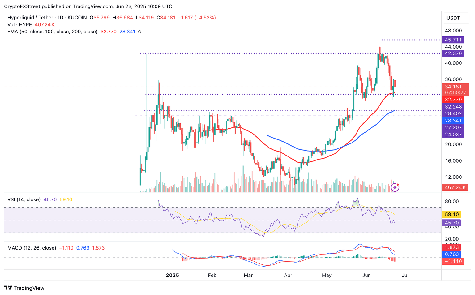 - Hyperliquid se detiene por debajo de 37.00$ tras caer desde un máximo histórico de 30.93$.