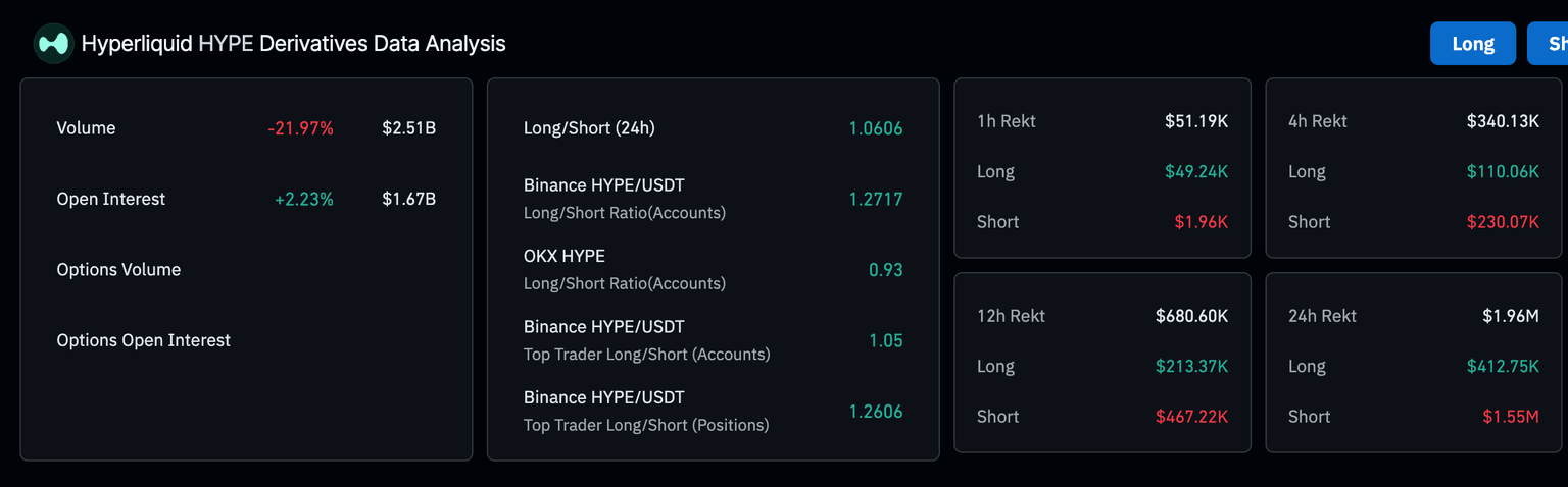 El aumento en el volumen, a medida que las liquidaciones se disparan a 1.96 millones de dólares en las últimas 24 horas, es una indicación alcista de una posible recuperación por short squeeze a medida que los operadores compran HYPE para cubrir sus posiciones. Además, las liquidaciones de posiciones cortas de 1.55 millones de dólares superaron significativamente las posiciones largas de aproximadamente 413.000$ en las últimas 24 horas. Un ratio de largo a corto de 1.0606 implica que los operadores tienen un mayor apetito por el riesgo y están apostando por la recuperación de Hyperliquid.