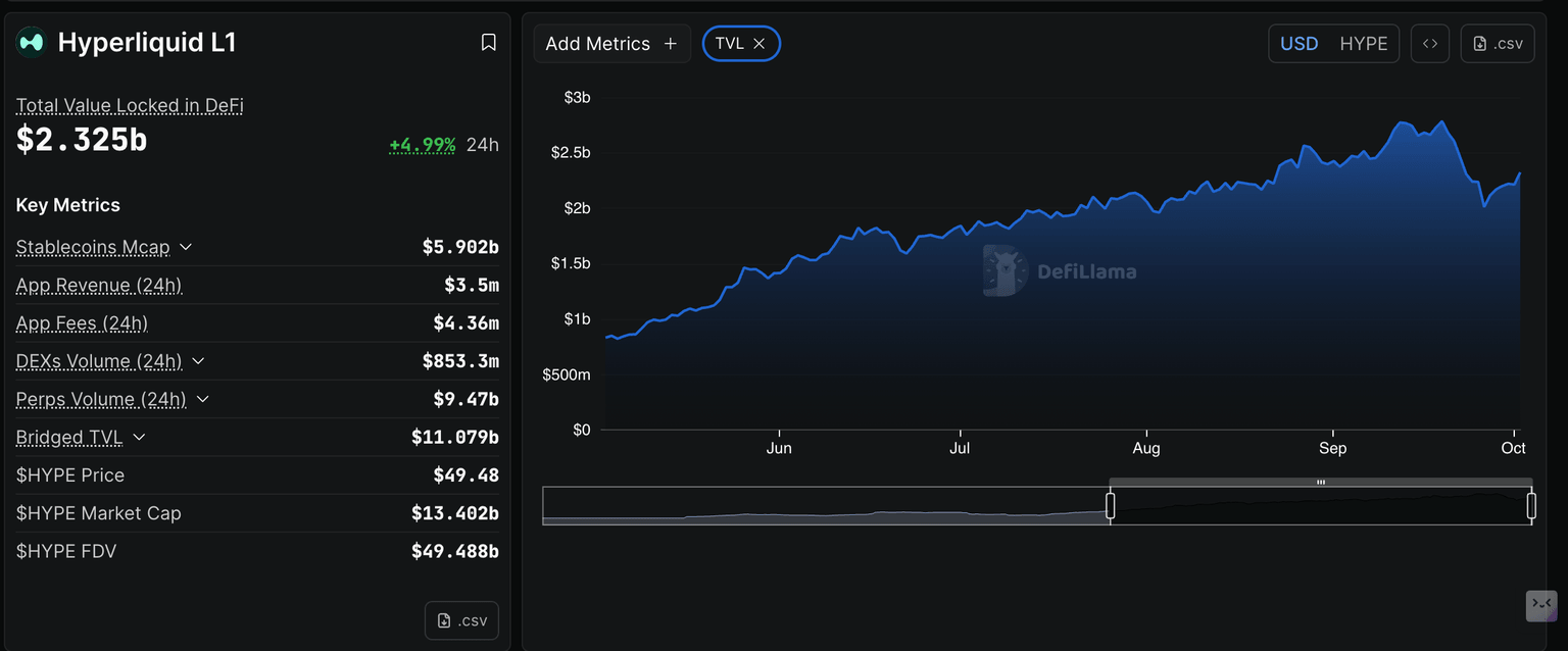 Los hitos clave dentro del ecosistema también apoyan la perspectiva alcista de HYPE, particularmente el lanzamiento de HUSD, la stablecoin nativa de la plataforma DEX. El ecosistema de Finanzas Descentralizadas (DeFi) de Hyperliquid también ha ganado impulso tras importantes caídas en septiembre, lo que ha respaldado el sentimiento alcista en torno al precio de Hyperliquid.