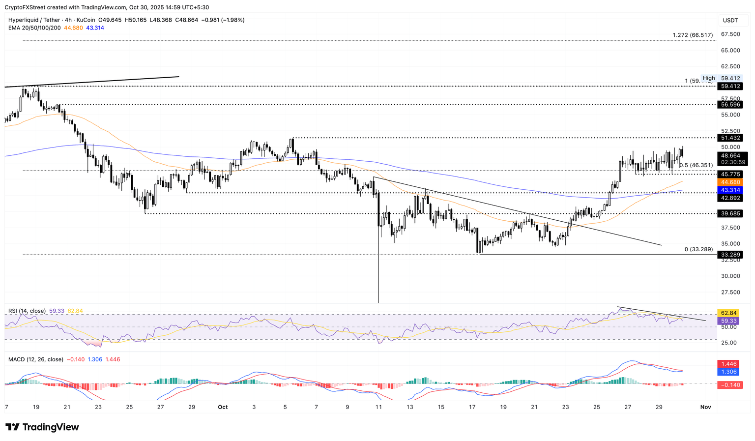 Hyperliquid cotiza por encima de 48$ en el momento de la publicación el jueves, mientras los compradores luchan por recuperar el hito de 50$. El token HYPE se consolida por encima del nivel de retroceso de Fibonacci del 50% en 46.351$, trazado desde el pico del 18 de septiembre de 59.412$ hasta el mínimo del 17 de octubre de 33.289$.