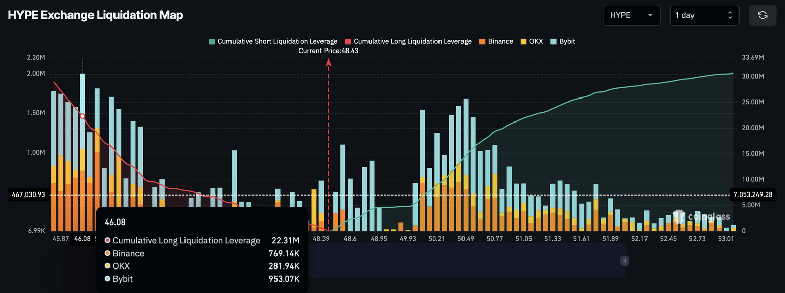 Además, el mapa de liquidaciones destaca más de 22 millones de dólares en posiciones largas en riesgo si HYPE vuelve a visitar la marca de 46$.
