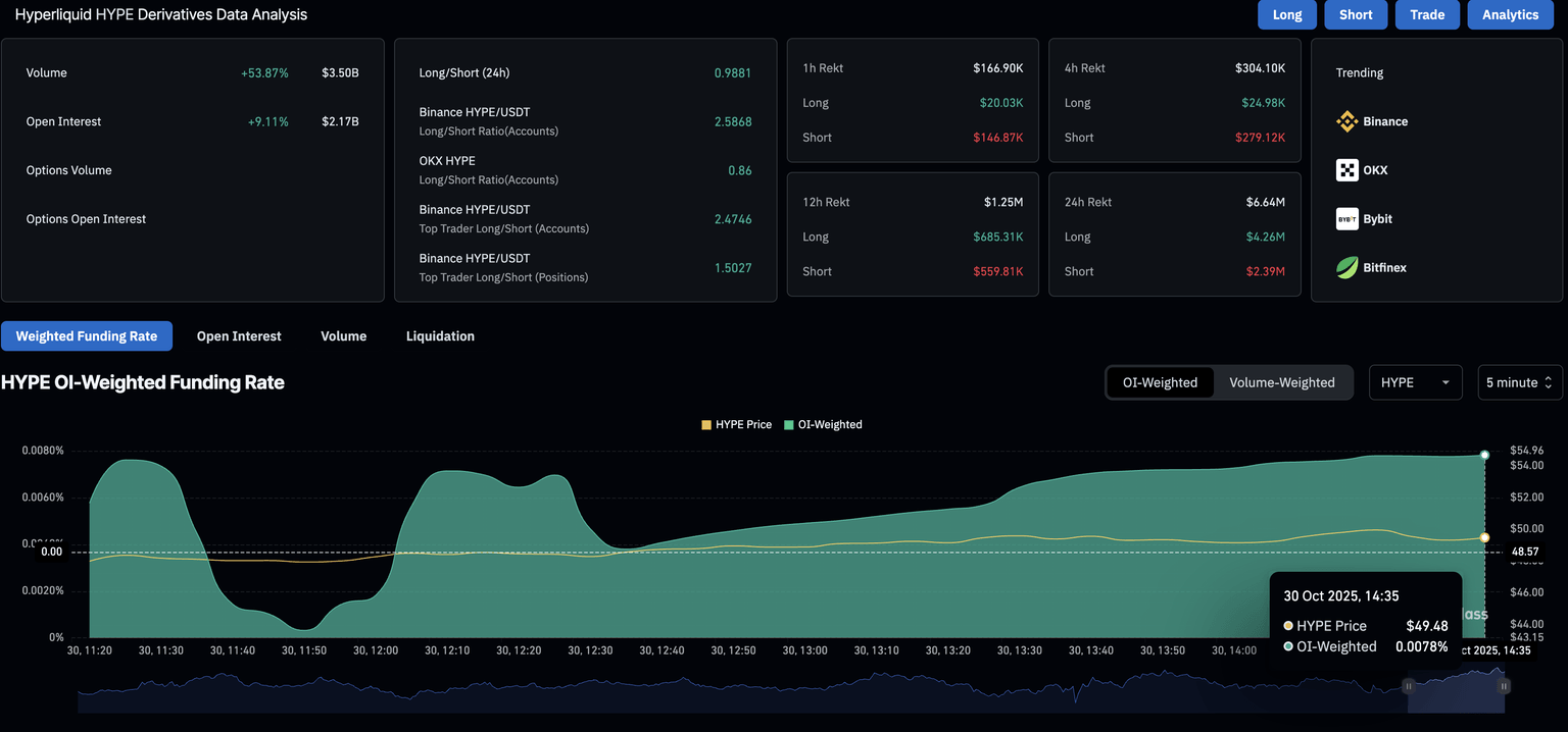 La demanda de Hyperliquid en el segmento minorista sigue siendo fuerte a medida que los operadores anticipan un posible repunte. Los datos de CoinGlass muestran que el Interés Abierto (OI) de futuros de HYPE ha aumentado un 9.11% en las últimas 24 horas, alcanzando los 2.17 mil millones de dólares, lo que indica una inclinación alcista en el suelo de precios.