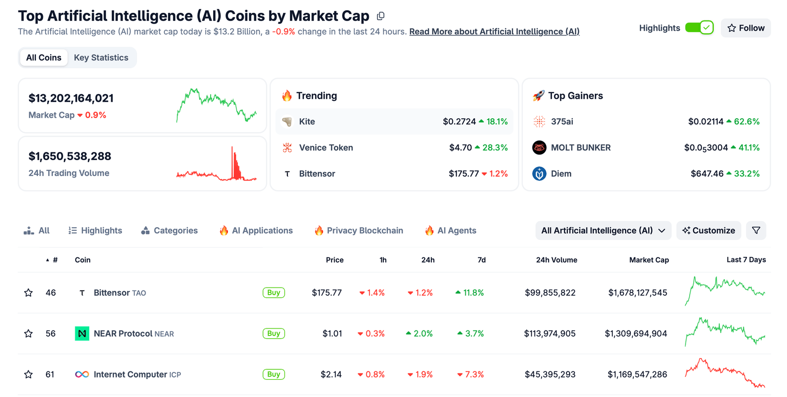 - La capitalización de mercado del segmento de IA cae a 13.2 mil millones de dólares mientras tokens líderes como Bittensor luchan.