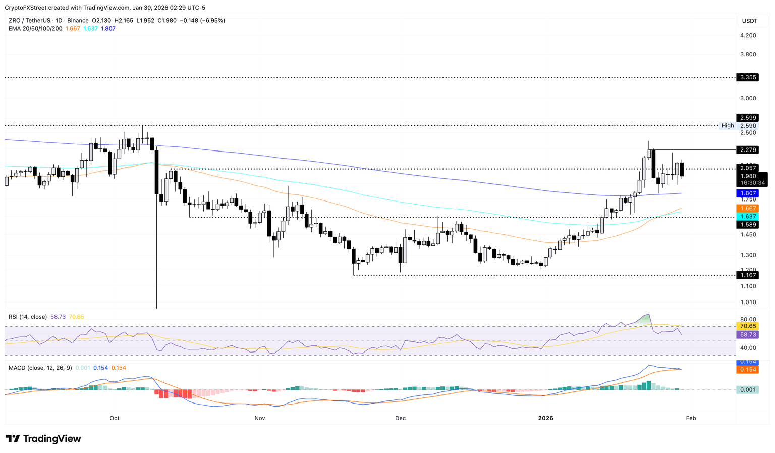 LayerZero está bajando un 7% en el momento de la publicación el viernes, eclipsando las ganancias del 6% del día anterior. La corrección cruza por debajo de la marca de 2.00$, con los bajistas apuntando a la EMA de 200 días en 1.80$, lo que implica un descenso de aproximadamente el 10% desde el precio actual.